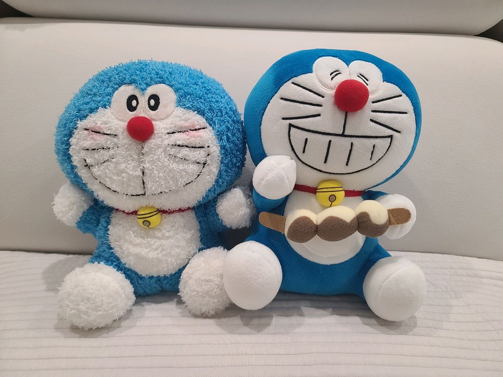 복슬복슬한 도라에몽 인형 두 개 판매해요 왼쪽 인형은 눈에 하트가 있고, 오른쪽 인형은 입에 무언가를 물고 있어요 두 인형 모두 목에 방울이 달린 빨간색 목걸이를 하고 있어요 사진에 보이는 그대로의 상태이고, 깨끗하게 보관했어요. 예민하신분은 패스. 타노스 인형 팝니다. 일괄판매입니다. 안심결제. 비대면직거래.