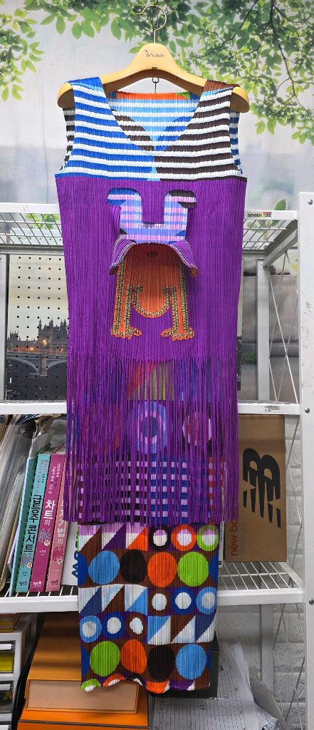 플리츠플리즈 이세이미야케 핸드스탠드 여름 나시원피스 거꾸로 선아이 자수 (앞으로 떨어지는 디자인..사진참조) 하단 긴프린지 포인트 상하의 세트느낌의 롱드레스 희귀템 아카이브 피스 made in japan 3사이즈 프리사이즈 키165기준 55~66 원피스 기장 118cm 사용조금 상태좋음 * 마지막 사진 가디건 코디 세트 구매가능 (세트가격 :120만원) ※ 문의. 무료배송 : O1O-22O7-5656 ※