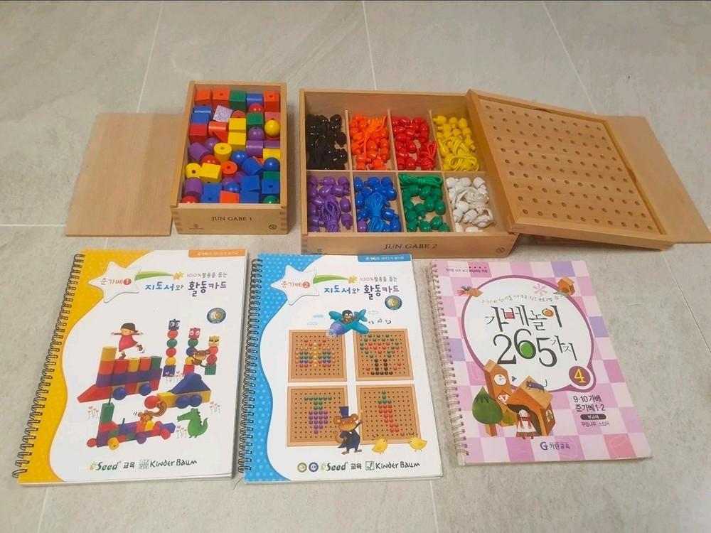 준1가베, 준2가베 + 지도서 2권 + 가베놀이 교재 1권 가베가족 준가베 고급원목 제품입니다. 특A급 새상품 컨디션입니다. 우린 나이에는 조작하기 편한 준가베로 시작해서 창의가베 수학가베로 자연스럽게 연결돼요. 교재가 있어서 엄마표로 충분히 진행할 수 있어요.