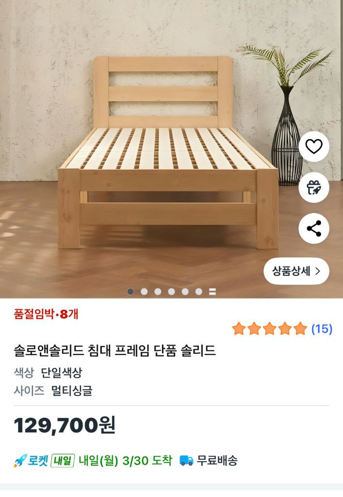 개인정보(거래정보)를 주고받는 행위는 사기에 노출될 수 있으므로 즉시 중고나라로 신고해 주세요솔로앤솔리드 침대 프레임 멀티싱글 사이즈로 공간 활용도가 높아요 DIY 설치가 간편하며 튼튼한 깔판이 특징입니다. 매트리스까지 같이 10만원입니다. 별도 구매 가능 분해해두었습니다. 각각 구매시 5만원
