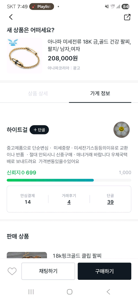 18k를 판매하는 판매자 중고제품이라고 적어놓고는 법망을 피하려는 의도로 가지고 있습니다. 새제품 팔고 있으며 가짜 보증서를 미끼로 판매중이에요. 전문 판매자 정황 확인되었고 문제 제품 보내고 저를 차단했습니다.이판매자는 사기기망과 탈세 정황으로 고발되어 있어요. 문제제품 보내고 바로 저를 차단했고, 신고하겠다고 하니까 바로 그날 탈퇴하고 다른 계정에서 판매중입니다. 그리고 그계정에도 저를 이미 차단했네요. 번개장터 화이트주얼,순옥경이네요. 화이트주얼 탈퇴예요 본명은 김은경 농협계좌 주의하세요.