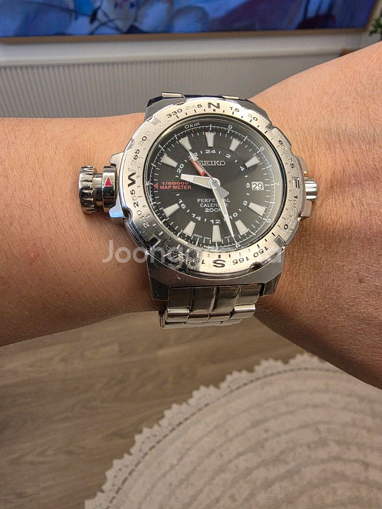 세이코 SLT095 맵 미터 (8F56) 쿼츠 [상세 내용] 세이코의 명기 8F56 무브먼트가 들어간 SLT095 맵 미터 모델입니다. 단종된 희귀 모델이라 구하기 힘든 녀석이죠. 보시다시피 이 시계는 애지중지 모시는 드레스 워치가 아닙니다. 캠핑, 낚시, 아웃도어 활동에서 터프하게 굴리는 툴 워치입니다. 스틸 케이스와 베젤에는 세월의 흔적과 실사용 기스가 좀 있지만, 오히려 이게 이 시계의 정체성을 더 잘 보여준다고 생각합니다. 중요한 건 유리는 기스 하나 없이 깨끗하다는 점과 배터리 상태 아주 짱짱하다는 점입니다! 바로 가져가서 실사용하시면 됩니다. [상세 사양 및 특징] -무브먼트: 8F56 고정밀 퍼페추얼 캘린더 (날짜 알아서 맞춤) -기능: GMT(두 나라 시간), 맵 미터(지도 거리 측정), 200m 방수 사이즈: 손목 둘레 18.5cm까지 여유 있게 맞습니다. 웬만한 장사 체구이신 분들도 편하게 착용 가능합니다. -상태: * 유리: 기스 없음 (매우 깨끗) -스틸/베젤: 실사용 기스 있음 (터프한 맛으로 착용 권장,찍힘은 아님) -배터리: 상태 아주 좋음 [구성품] -시계 본체 (제치 메탈) -판매 가격: 30만 원 -거래 방식: [마곡, 김포 직거래 / 택배 거래 가능] 빈티지 세이코 툴 워치의 매력을 아시는 분, 손목 굵고 묵직한 존재감을 원하시는 분께 강력 추천합니다