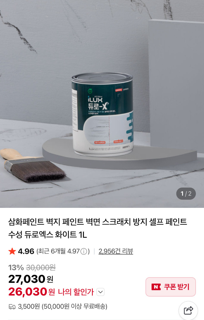삼화페인트 듀로-X 밀크 화이트 1L 페인트와 페인트 도구 세트예요 스크래치 방지 기능이 있어 벽면을 깔끔하게 유지할 수 있어요 새 제품 가격보다 저렴하게 구매할 수 있는 기회예요 문서 작업이나 영상 편집 등 집중이 필요한 공간에 차분한 분위기를 연출하고 싶으신 분들께 추천드려요