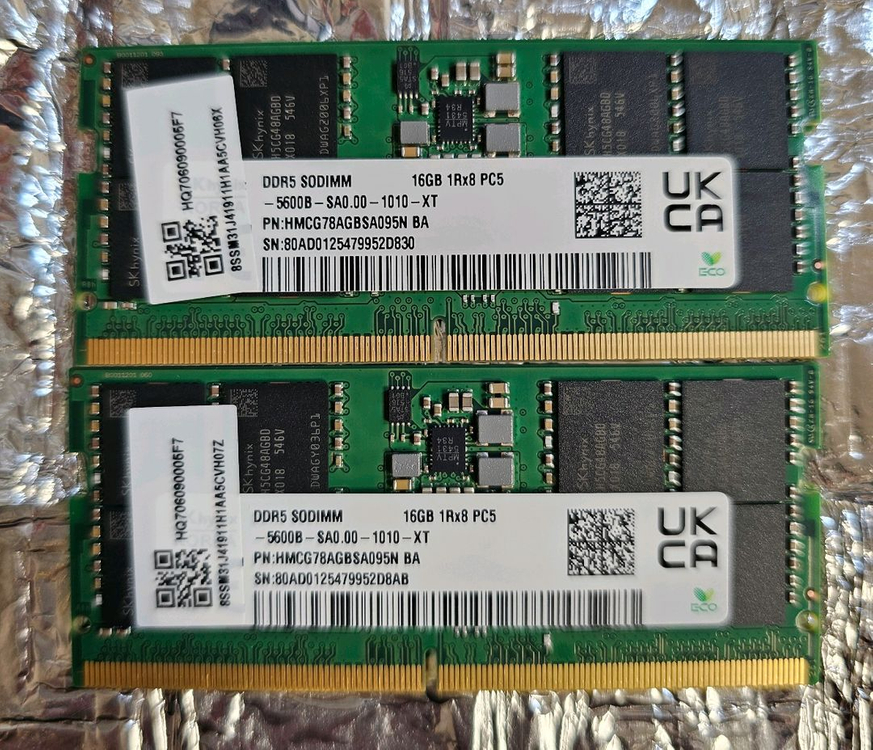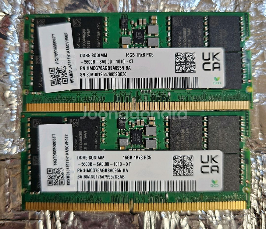 DDR5 16GB 메모리 2개입니다. 상태 양호하고 정상 작동 확인했어요. 컴퓨터 업그레이드나 추가 메모리 필요하신 분께 추천드려요! 직거래나 선입금 택배거래만 합니다 노트북 구매후 램 업그레이드하고 남은겁니다! 25년 47주차 생산품 개당 22입니다