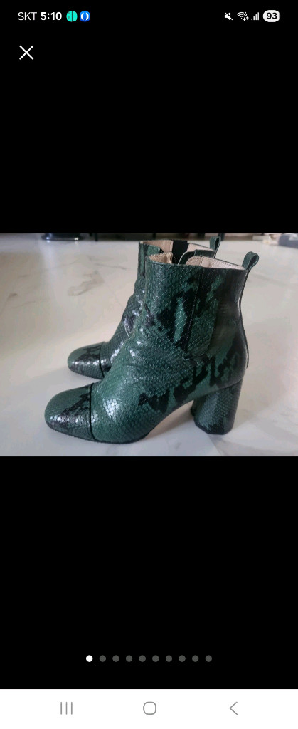 개인정보(거래정보)를 주고받는 행위는 사기에 노출될 수 있으므로 즉시 중고나라로 신고해 주세요슈콤마보니 앵클부츠 38사이즈 새상품 뱀피 패턴 앵클부츠예요! 그린 컬러에 블랙 스네이크 무늬가 고급스럽고 예뻐요. 미착용 새제품이라 상태 완벽합니다미사용 풀박스