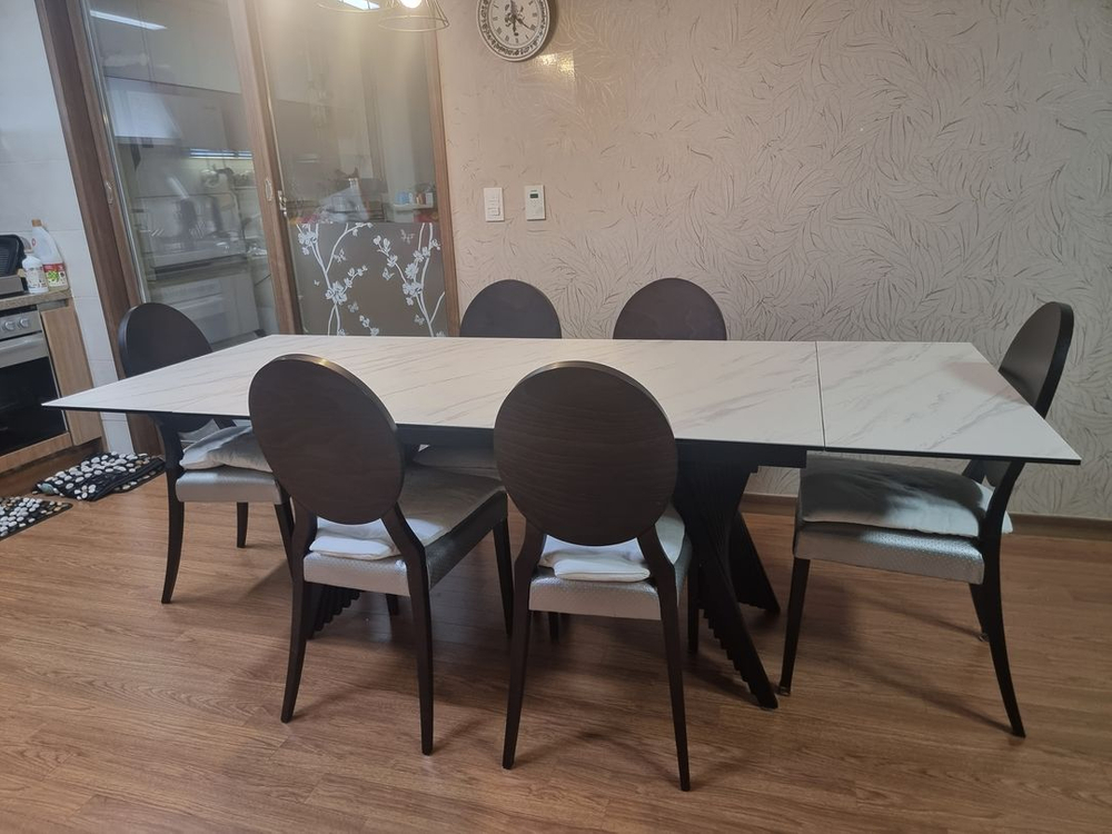 디쟈트 세라믹 확장형 식탁 - 6~8인용 사이즈 - 확장전 : 1500 x 950 x 750 (mm) - 확장후 : 2300 x 950 x 750 (mm) 깔끔한 화이트 상판과 브라운 다리로 구성된 6인용 식탁세트예요. 의자 6개가 포함되어 있고 상태도 양호합니다. 모던하고 세련된 디자인으로 어떤 인테리어에도 잘 어울려요. *김치국물이 식탁에 흘러도 스며들지 않습니다 직거래, 서울시 서초구 우면동(양재1동) 이동중 손상 방지를 위하여, 직접 가져가시는걸 추천합니다. 구입때 287만원 줬습니다.