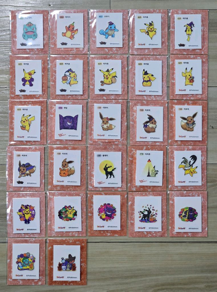 포켓몬 띠부씰 할로윈 야광씰 27종 개봉, 미개봉 전종 세트입니다. 22년에 수집해두었지만 보관을 잘해서 시간에 비해 상태는 최상입니다. 개봉 상품은 뗀 씰이나 종이갈이가 없습니다. 개봉, 미개봉 모두 OPP 필름을 씌워 보관했습니다. 출처 없는 곳에서 저렴하게 구매한 것이 아니라 제가 직접 수집했습니다. 매너 거래 부탁드립니다. 개봉 세트: 9만원 미개봉 세트: 14만원 2세트 일괄: 20만원