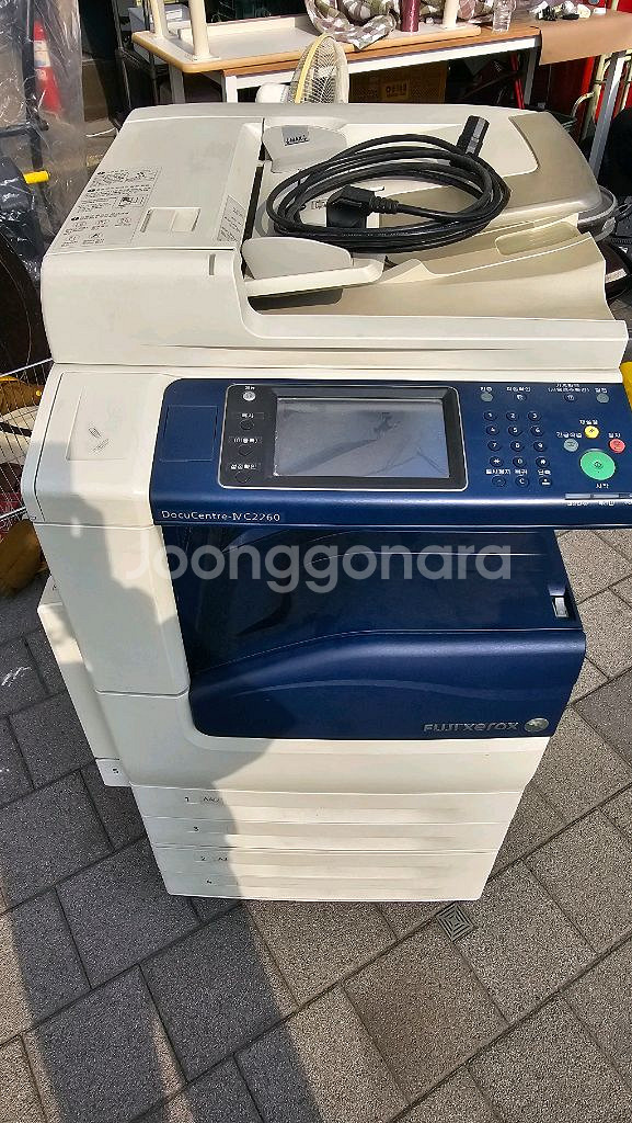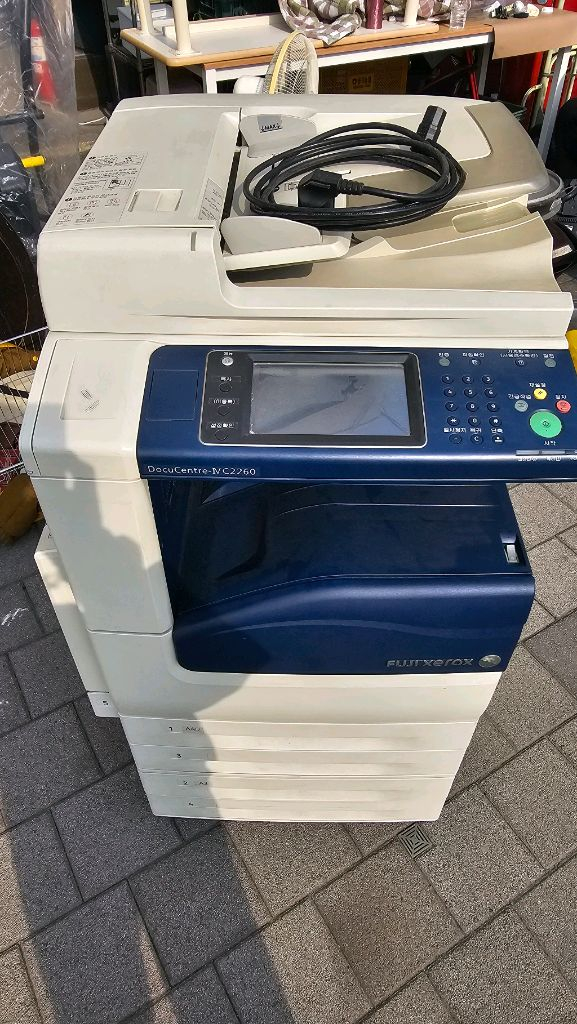 컬러 복합기입니다. 프린터, 스캔, 복사 기능이 모두 가능하고 전원 케이블도 포함되어 있어요. 사용감은 있지만 정상 작동하는 상태입니다. DocuCentre-IV C2260