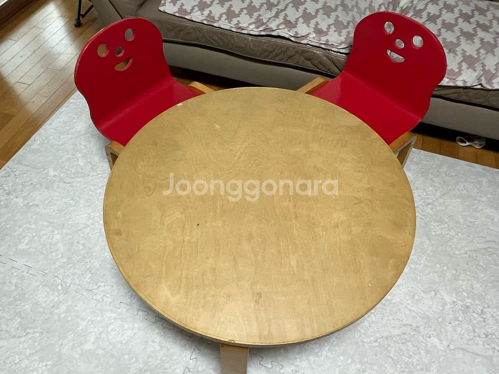 토리 어린이 원목책상 팝니다 원형책상에 의자 2개 포함입니다 책상은 깔판을 깔고 사용했는데 깔판에는 낙서가 좀 있고 책상도 까짐이 좀 있으니 참고 부탁드립니다 의자도 까진 부분이 조금씩 있어 사진 참고해주세요 의자는 나사로 높이조절 가능합니다 마지막 사진에 보이는 것처럼 책상 나사를 하나 잃어버려서 사용하는데는 크게 문제 없지만 마지막 사진 참고 부탁드립니다