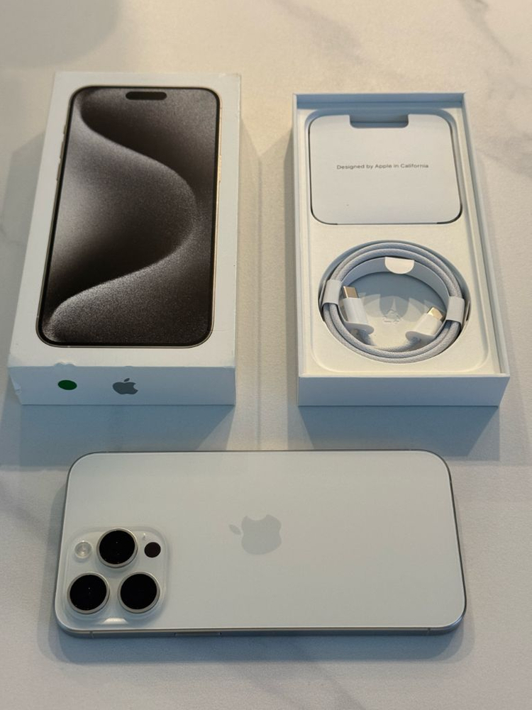 [물리 듀얼 유심, 카메라 무음, 자급제] 아이폰 15 프로맥스 홍콩판 256GB 판매 합니다. 홍콩판이라 유심 2개 동시에 사용 가능하고, 카메라 무음도 가능 합니다. 맥도도 액정 강화필름 붙여 놓았고, 폰도 기스없이 깔끔 합니다. 색상은 화이트 티타늄이고, 배터리 성능은 84% 입니다. 원박스 포함 기본 구성품 빠짐없이 모두 있습니다. 직거래는 인천 숭의동에서, 가격 네고 문의에는 답하지 않습니다.