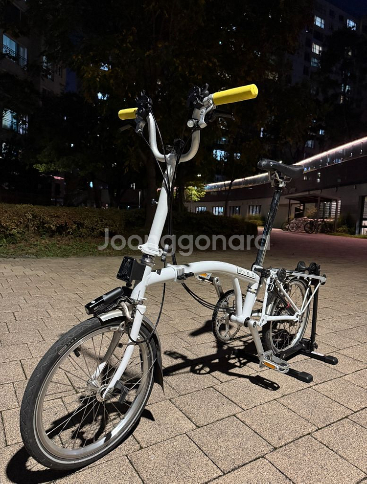 브롬톤 2014년식 M6R 화이트 컬러 2015년 2월에 구입하였고 많이 타지 않았습니다. 자잘한 기스외의 큰 데미지 없고 성능 매우 양호합니다 그당시에는 기본제공되지 않던 정품 캐리어블럭을 추가장착했습니다 라이트는 판매시 제외하며 핸들그립은 교체하시길 추천합니다 가격은 170만원이며, 거래는 압구정역, 잠실역, 강동역에서 가능합니다