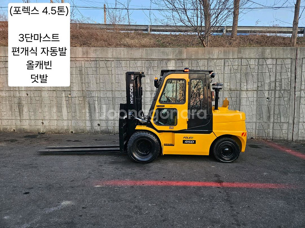 중고지게차 현대 포렉스 45D 디젤 4.5톤 3단 지게차 (편개식자동발, 3단,올캐빈,덧발) < 현대 포렉스 45D > 제품명 : 포렉스 45D 제조사 : 현대 규 격 : 4.5톤 디젤지게차 옵 션 : 3단마스트, 편개식자동발, 캐빈, 덧발 년 식 : 2007년 가 격 : 1,850 -> 1,650만원 차고지 : 경기도 화성시 남양읍 (화성IC에서 5분거리) 2007년식 현대 포렉스 45D 4.5톤 3단마스트 디젤지게차입니다. 전반적으로 년식 대비 컨디션 좋습니다~ 더블 타이어로 장착되어 있어, 회전, 경사로 운행시 매우 안전합니다~ 편개식자동발 장착되어 있어 작업이 편리합니다. 통 캐빈으로 되어 있어 외부 환경에 영향없이 쾌적하게 작업할수 있습니다. 습식브레이크라 제동력도 완벽합니다~ 덧발도 끼워져 있어 추가 비용없이 경제적 입니다. 신차대비 저렴한 가격에 컨디션 좋은 특 A급 장비로 사업 번창하시길 바랍니다~ 좋은 지게차로 보답드리겠습니다~ 궁금하신점 언제든 편하게 연락 주시고 방문하셔서 시운전도 해보시고 결정하세요~ 거리상 직접 방문이 어려우시면 동영상 시운전도 가능합니다~ 많은 문의 부탁드립니다~ 감사합니다