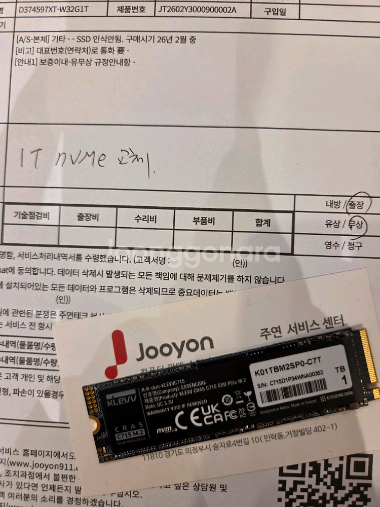 M.2 NVMe SSD 1tb입니다. 초기불량으로 교환받고 미사용입니다 as기사님이 박스는 까고 주셔서 저 상태입니다. 택배 거래시 잘포장해서 드리겠습니다