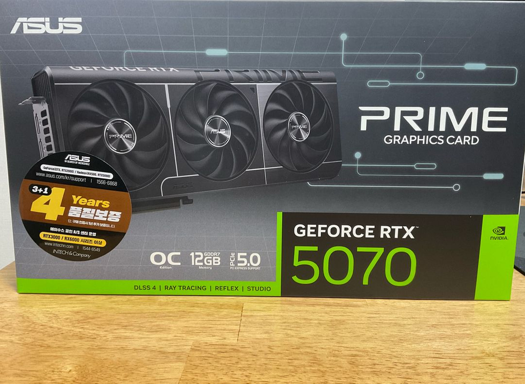 ASUS PRIME 지포스 RTX 5070 OC D7 12GB 미개봉품 팝니다. 구매일자 3월 24일 AS 1년 연장 등록 완료한 상태이며 영수증과 같이 드립니다. 가격 88만원 직거래 : 천안 안전결제 X