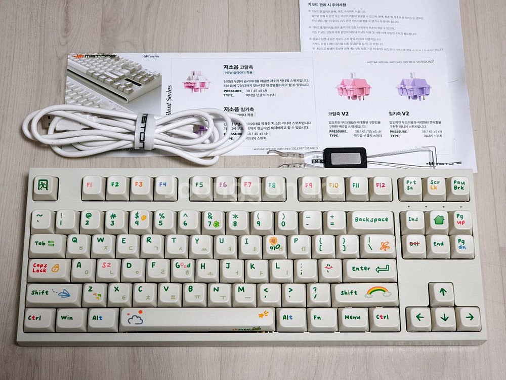엠스톤 그루브스톤 GV8 저소음 밀키축 45g 크레용 텐키리스 키보드 판매합니다. 텐키리스 규격의 기계식 키보드로, 저소음 밀키축을 사용하여 사무용으로 추천드립니다. 테스트 후 미사용, 풀박스이며 구성품 대부분 있지만 a to c 젠더가 빠졌네요. 필요하시면 다른 변환케이블로 드리겠습니다. 직거래(익산/전주), 택배거래, 안전결제 가능합니다. 가격은 네고 가능하며, '거의 새것' 상태의 제품 시세에 따라 합리적으로 조율 가능합니다. 택배거래 시 파손면책입니다. 초기불량에 대해서는 반품/교환 등으로 대응해드립니다. 구매문의는 채팅 부탁드립니다.