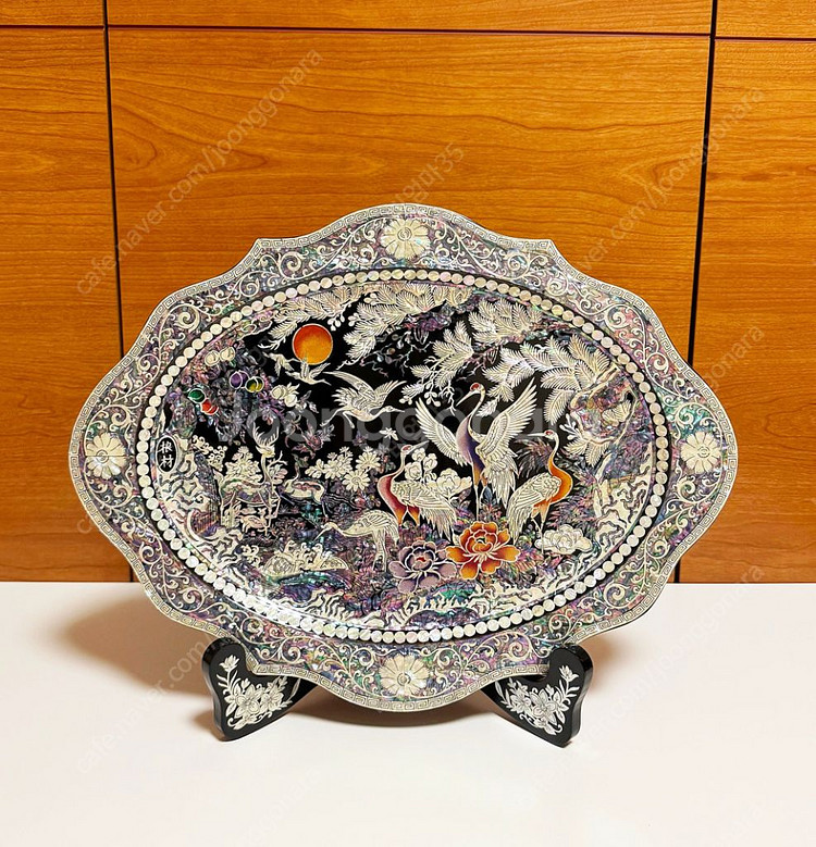 명품나전칠기 십장생 타원쟁반 과 받침대 세트로 판매해요. 선물받은 제품으로 새상품이예요. 싸이즈는 가로 39센티 * 세로 30센티 , 불로장생 무병장수라는 상징의 십장생을 섬세하고 화려하게 표현한 랑재 김영만 작가작품이예요.. 사진상으로는 아름다운 색감이 표현이 잘 안돼네요. 실제로 보시면 훨씬 더 아름답고 고급스럽구여~~ 그냥 장식해 두시면 넘 멋스러워요.. 쟁반부분과 받침대에도 자개로 장식되어 있어요.. 서울 광진구 근처시면 직거래 가능하구여~ 택배로도 배송해드려요.