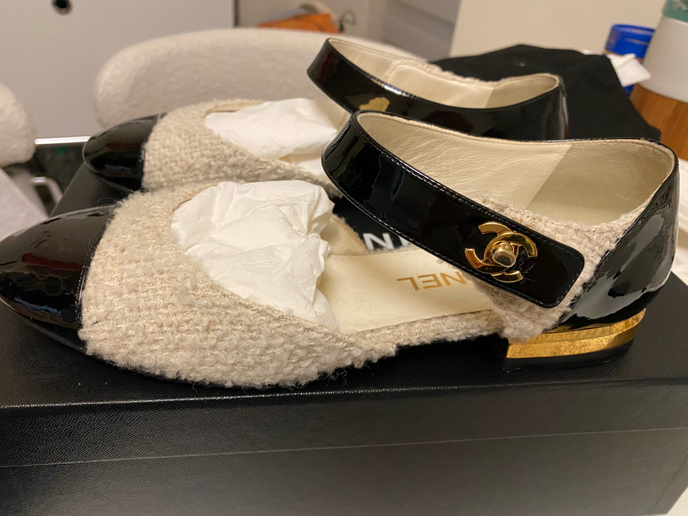 샤넬 트위드 메리제인 슈즈 사이즈 38 금사섞인 트위드로 고급스럽고 블랙 페이턴트와 잘 어울리는 디자인이고 샤넬 턴락장식이 돋보이는 편한 메리제인슈즈입니다. 비브람깔창 작업되어있고 부속품은 박스, 더스트백 2, 그외 리본등 있습니다. 어느정도 착용감 감안하여 가격올렸습니다. *가품은 구매도 판매도 하지않습니다. *택배 당일배송가능(우체국택배 배송료포함), 직거래는 문의 *반품 환불불가니 신중한 구매 부탁드립니다^^