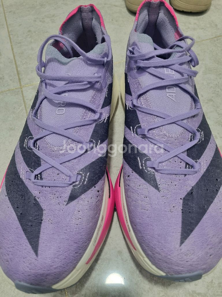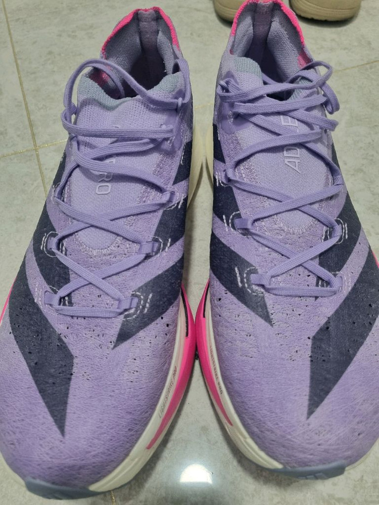 아디다스 아디제로 프라임 X3 스트렁 운동화입니다 보라색 공식 컬러명은 powder plum Aurora black 입니다 카본이 2장이고 50mm의 미드솔로 정말 재밌고 고스펙의 러닝화이며 사이즈 이슈로 딱한번 5km정도 조깅하고 한번도 안신은 거의 새상품입니다! Kream 에서 결제했고 원하시면 결제내역 사진 보내드려요 감사합니다ㅎ