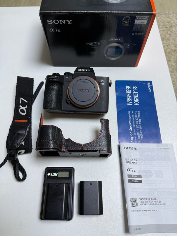 소니 A7M3 풀프레임 미러리스 카메라 판매합니다. 속사케이스, 스킨스티커, 액정보호필름 붙여서 소중히 사용하였습니다. (하단에 희미한 기스가 있는데 사진 첨부하겠습니다!) 스킨스티커는 판매를 위해 모두 깔끔히 제거하였으며, 액정보호필름은 아직 부착되어있습니다. - 셔터 카운트 94,141컷 카메라 상태 좋으며 모든 기능 정상 작동합니다. 구성품: 박스, 호환배터리2개, 충전기, 스트랩, 림즈 속사케이스(11만원에 구매) 포함 *뷰파인더 아이피스는 잃어버려서 호환 아이피스 구매후 장착되어 있습니다. 성남 모란역, 평일 퇴근시간대 강남구청역 직거래 가능합니다.