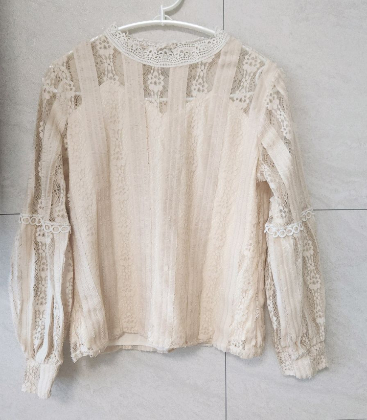 섬세한 레이스 디자인과 소매가 여성스럽고 예뻐요. 가슴라인쪽 이중 덧대여있어 따로 나시티 받춰입지않아도 됩니다. 옷 컨디션 좋습니다. 가슴단면: 46 총길이: 52 선입금 확인후 택배발송 해드리는점 양해부탁드립니다.