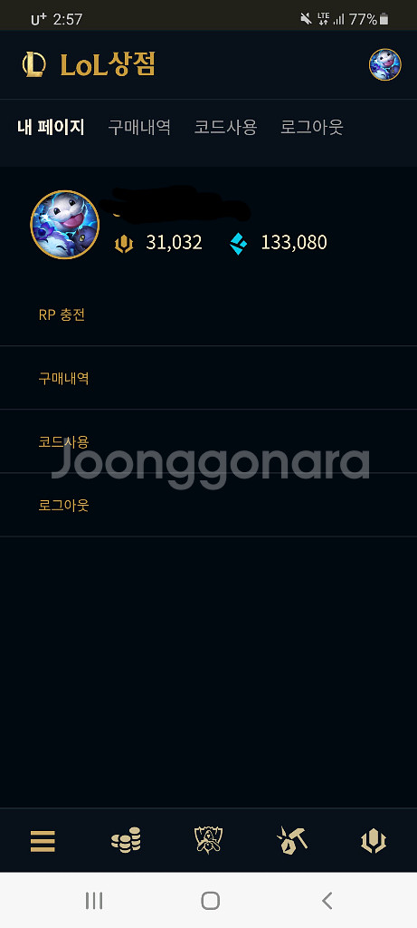 개인정보(거래정보)를 주고받는 행위는 사기에 노출될 수 있으므로 즉시 중고나라로 신고해 주세요롤RP 1RP당5원팝니다 RP선물은 불가입니다 스킨이나 마법공학라구만 선물가능해요 채팅주세용