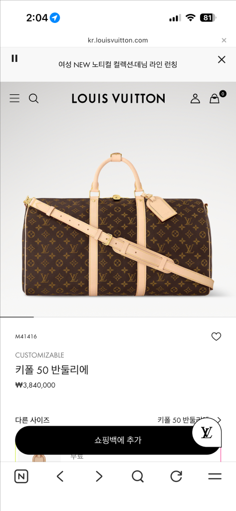 개인정보(거래정보)를 주고받는 행위는 사기에 노출될 수 있으므로 즉시 중고나라로 신고해 주세요24년 겨울 아니면 25년 봄 구매 대전 갤러리아 루이비통 매장 구매 현재 대전 신세계로 이전. 1,2회 사용. 잘 보관해서 새상품 같은 컨디션. 핫스탬핑 서비스 받아 사진과 같이 DK 있음. 300만원
