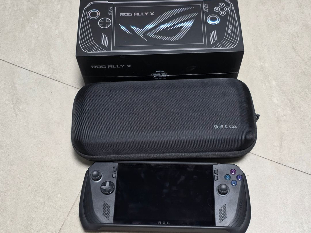 ROG ALLY X(흑갈리) 1TB 판매합니다. 구매시기 : 2024년 8월 7일 사서 스팀 디맥 간간히 하다가 반년 넘게 계속 쓰지 않았습니다. 실 사용 기간은 구매하고부터 다 합쳐도 반년 조금 안됩니다. 디맥 DLC 나올때만 켜서 하고 그랬던지라... 상자 기본 구성품 다 있고 기본 충전기는 한번도 사용 안 했습니다. 그리고 스컬 앤 코 하드커버와 파우치도 같이 드립니다. 액정에 AR보호필름도 붙여져 있습니다 본체는 1TB이고 초기화 진행해서 사용하실 때 와이파이 연결해서 사용하시면 됩니다. 초기화 하기전에 한번 정상 동작하는지 확인하고 초기화 했습니다. 구매 원하시는 분은 카페 채팅 주세요