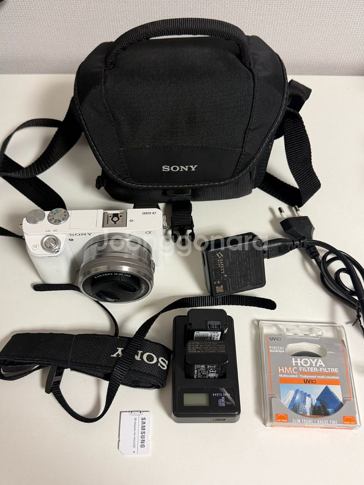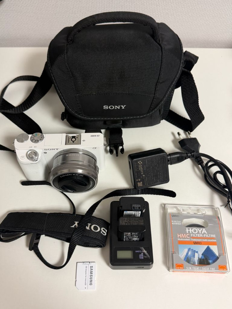 소니 A6000 미러리스 카메라 화이트 색상입니다. 약 4-5천컷 사용이고, 수리 전적 없습니가. 하단 부분 살짝 벗겨진 부분 있는 거 확인하시고 구매해주세요 구성품: 카메라 본체, 번들 렌즈(E 3.5-5.6/PZ 16-50 OSS), 배터리 2개, 배터리 충전기, 전원 어댑터, USB 케이블, 스트랩, 카메라 가방, 삼성 SD 카드, HOYA UV 필터 네고 문의 답변드리지 않습니다. 택배 거래 착불 또는 +4,000 입니다.