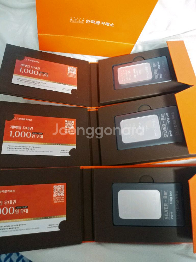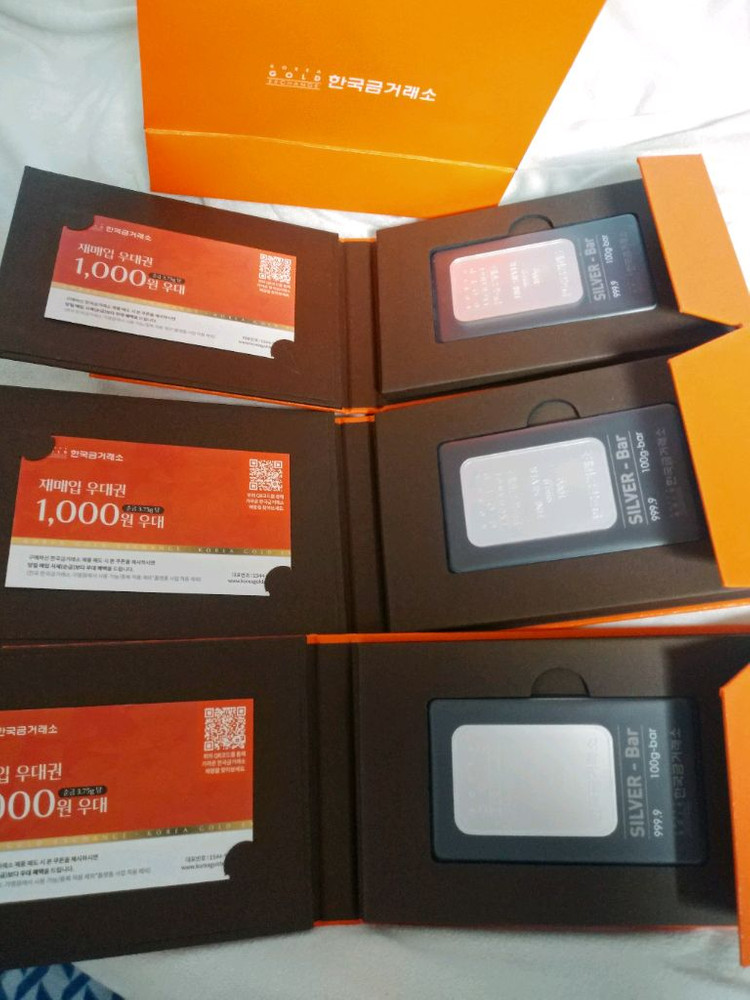 개당53만원입니다ㆍ한국 금거래소에서 발행한 100g 실버바 3개입니다. 박스와 케이스 모두 깔끔하게 보관되어 있어요. 투자용이나 선물용으로 좋을 것 같습니다.서청주 우체국안에서 직거래현금거래만 원합니다ㆍ네고×계좌이체× 주문하고 4개월 걸리네요^^새상품임니다ㆍ
