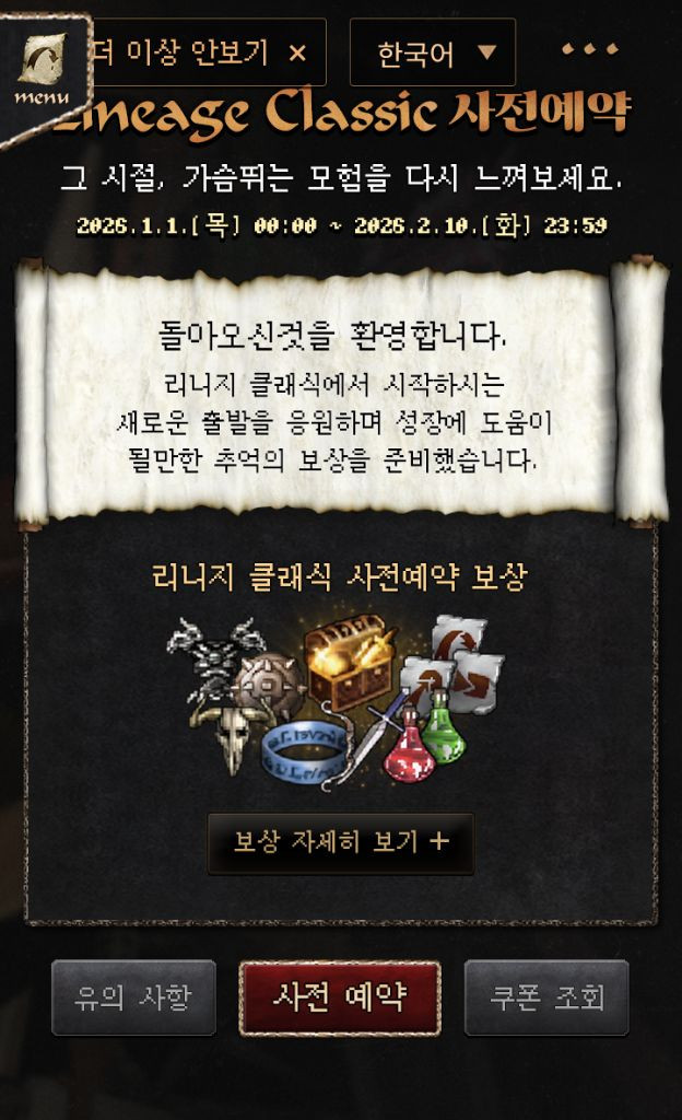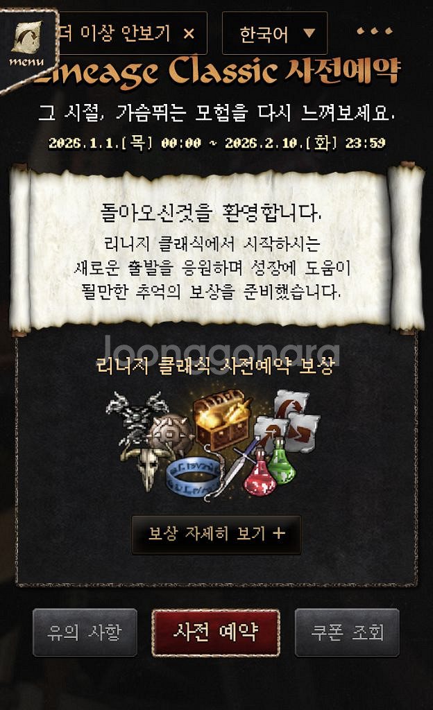 네고X 네고X 네고X 리니지 클래식 1차 사전예약 쿠폰 1장 30000원 여러장 가능. 쿠폰등록 및 사용기간 : 2026-02-07 20:00 ~ 2026-04-01 06:00 ※ 쿠폰은 계정당 1회만 등록할 수 있습니다. 상품 설명 및 유의사항, 상품 정보 이미지를 꼭 보고 구매해 주세요. https://lineageclassic.plaync.com/ko-kr/conts/260101_teasing#preorder 이벤트ON https://lineageclassic.plaync.com/ko-kr/eventon/board/event_notice/view?articleId=69553a704984ee2095a3cc49 농협계좌 있습니다. 3자 사기는 사절합니다.