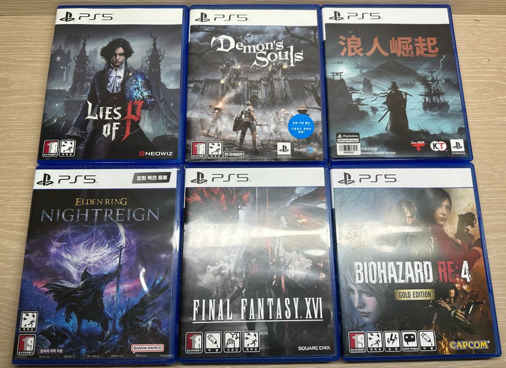 피의거짓-(판매완료) 데몬즈소울-(판매완료) 라이즈 오브 더 로닌-(판매완료) 엘든링 밤의통치자(미개봉)- 3.2 파이널판타지16- 2.5 바이오하자드re4 골드에디션(코드x)-(판매완료) 일반택배 3,800원 반값택배 1,900원 뽁뽁이 포장해서 당일날 안전하게 부쳐드립니다:) 연락주세요:))