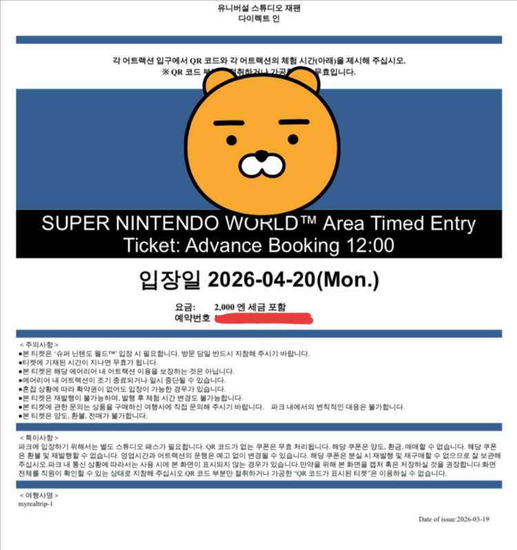 오사카 유니버셜 스튜디오 재팬(USJ) 입장권 + 닌텐도 월드 확약권(12시) + 간사이 조이패스(3개 선택) 2인 상품입니다. * 1인 별도 구매도 가능 입장일은 2026년 04월 20일 월요일이며, 부득이 사정이 생겨 여행자체를 못가게 되서 판매합니다ㅠㅠ 저는 마이리얼트립에서 구매했구요, 2인 한번에 구매시 20만원, 1인 구매시 12만원에 판매하고자 합니다. 거래(계좌이체)완료 후 QR코드가 포함된 입장권을 보내드릴 예정입니다~