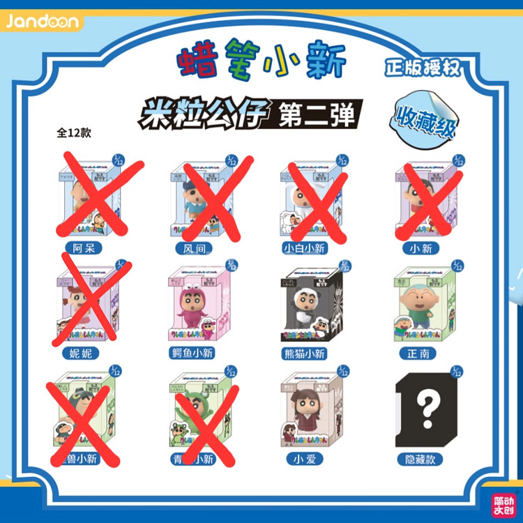 짱구 쌀알피규어 2탄 미개봉 새상품 판매해요 박스랑 카드 전부 보내드려요 박스에 홀로그램 스티커 붙어있는 정품입니다 ‼️ - 와니야마 짱구(+1,000원) - 팬더 짱구(+1,000원) - 훈이 - 수지 - 히든 시크릿 액션가면 짱구(+2,000원) 개당 판매 가격이에요 채팅으로 원하는 캐릭터 알려주세요 :)