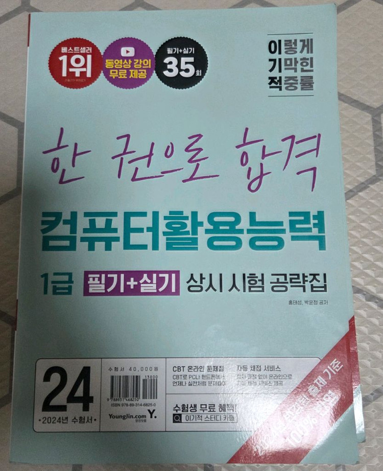 (62% 할인) 이기적 한권으로 합격 컴퓨터활용능력 1급 필기+실기 상시 시험 공략집 1. 책이름 : 이기적 한권으로 합격 컴퓨터활용능력 1급 필기+실기 상시 시험 공략집 2. 상태 : 새 책인데 1권 2권 분리됨 3. 가격 : 정가 40,000원 판매가 15000원 (편의점 반값택배) +2500 (일반 택배) +4,000