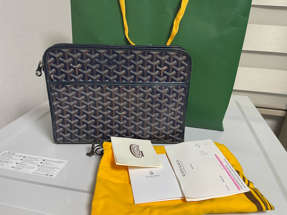고야드 쥬방스 클러치백 GM 네이비컬러 판매합니다. 22년 7월 21일 네이버쇼핑으로 177만원에 구입한 제품입니다. (서울 코엑스 22일 결제, 백화점 인보이스) 데일리로 자주 사용한 가방이라 아무래도 모서리 각진 부분들이 해져서 사용감 있습니다. 최대한 근접해서 사진 올렸습니다. 지퍼는 이상 없습니다. 감안하여 급매로 싸게 내놓습니다. 편하게 사용하실 분들께 추천드리겠습니다. 안산, 부천 직거래 원합니다.