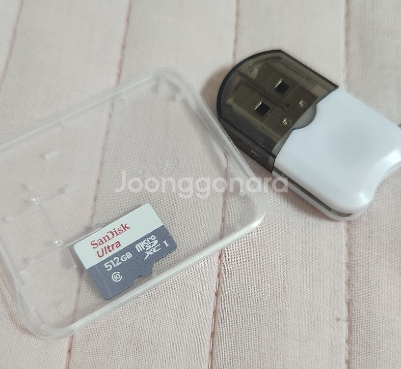 샌디스크 512GB SD카드와 전용 카드리더기가 함께 있어요. 한번도 사용 안 했고 잘못 주문해서 팔게 됐습니다. SD카드는 투명 케이스에 보관되어 있고 영상 저장용으로 딱 좋아요! 본가은 11만원 주고 샀습니다