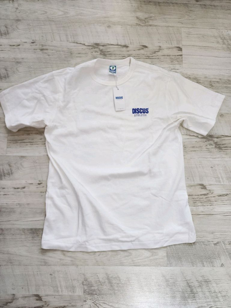 디스커스 반팔 티셔츠 입니다. L사이즈 표기이고 100~103사이즈 정도 입으시면 맞습니다. 가슴53cm 총장71cm 흰색 바탕에 파란색 로고가 포인트입니다. 기본 스타일이라 어디든 매치하기 좋습니다. 원단이 밀도 높아 탄탄하고 핏이 이쁩니다. 택달린 새상품이며 5만원 이상인 제품입니다.