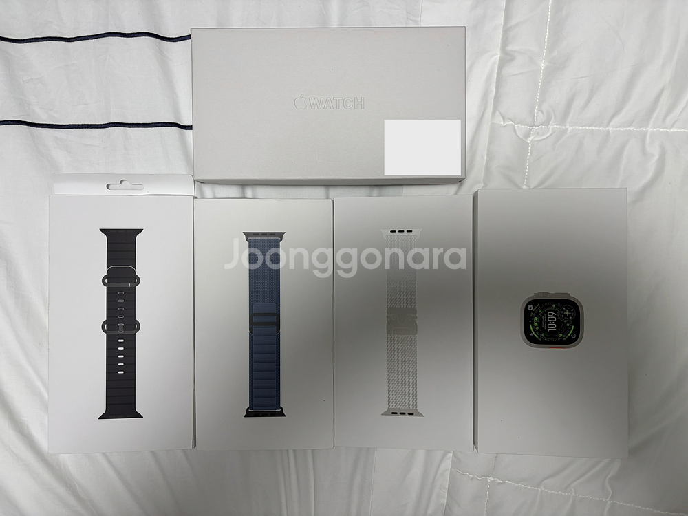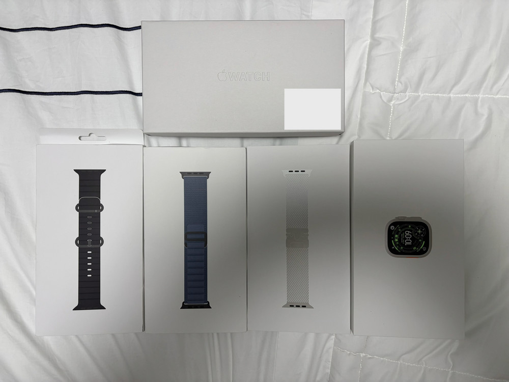 애플워치 울트라 3 49mm 티타늄 밀레니즈루프 라지(L) 사이즈 모델입니다. 새상품급 컨디션이며, 밀레니즈루프는 사용을 거의 안한상태 입니다. 한달전에 구매 했고, 잘안차서 판매합니다. 배터리 성능 최대치 100% 이고, 본체는 범퍼케이스 사용해서 새것과 같은 컨디션 입니다. 추기로 구입한 정품 알파인 루프(M)사이즈 1개 오션밴드(블랙)1개 밴드들도 착용을 거의 안하고 케이스에 보관중 입니다. 전부 포함가격 입니다.
