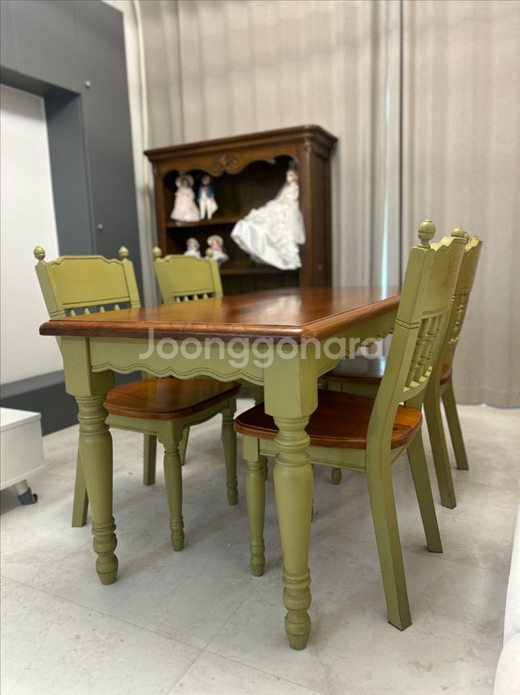 마들렌상점 엔틱 스타일 원목 식탁 의자 세트입니다. 은은한 올리브 색상과 나무색의 조화가 멋스럽습니다. 식탁 다리 부분의 조각 디테일이 고급스러움을 더합니다. 그외에 가구들 문의주세요. 직접 오셔서 가져가셔야해요 반품불가 신중구매하셔요. 직거래추천 뒷면에 꽃무늬 장식이 있어서 클래식하면서도 예쁜 느낌이 나요.