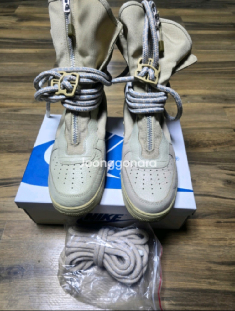 나이키 스페셜필드 에어포스1 하이 라탄 컬러. 남성용 모델 AA1128-200 사이즈 280mm (US 10) 입니다. 여분 미사용 정품 슈레이스 포함 포함 실착 5회 미만. 사용감 감안해서 가격 책정했어요. 그래도 예민하신분은 Pass ~ 우체국 택배로 발송 합니다. 택배비는 제가 부담합니다. (다른 박스에 넣어서 보내드릴께요 ~) YKK 지퍼에는 연장 스트랩 달아서 훨씬 편하게 신고 벗을 수 있습니다. ( 6번 사진 참고해주세요) ✅ 제품 정보 모델명: Nike SF Air Force 1 High ‘Rattan’ 스타일코드(남성용): AA1128-200 생산국: 베트남 (정품) 특징 밀리터리 부츠 느낌의 하이컷 디자인 가죽 + 발등 지퍼 + 내구성 좋은 나일론 소재 발목을 감싸는 로프 스타일 끈 디테일 현재 여성용 새상품(AA3965-200)이 269,000원대에 판매 중인 한정판 라인 실물이 훨씬 멋집니다.