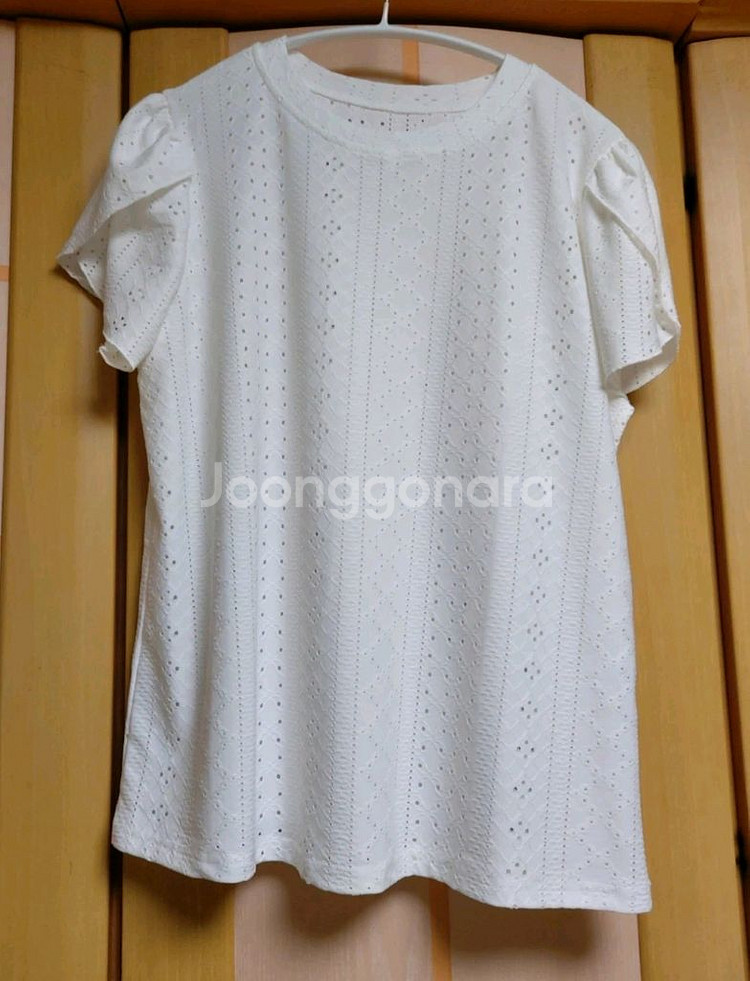 아이보리색 반팔 블라우스입니다. 레이스 디테일이 포인트로 들어가 있어요. - 사이즈는 77이며, - 가슴단면 53cm, 총기장은 64cm 정도 됩니다. 레이스 디테일이 포인트로 들어가 있어요. 가볍고 부드러운 소재로 착용감이 좋습니다. (목부분 뒤 단추 있음) (구입 후 반품, 환불 불가)