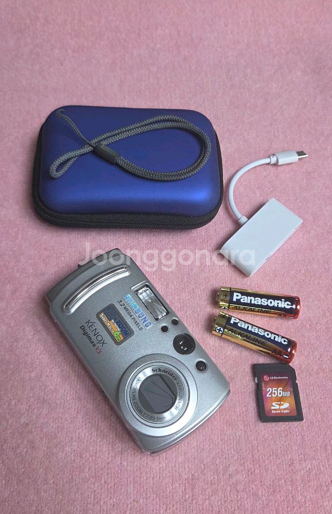 삼성 케녹스 디지맥스(Digimax) V3 풀구성으로 구매후 바로 사용가능합니다.. 빈티지 감성 느낌 그대로 전달됩니다... 2003년에 출시된 모델로, V20의 상위 기종이자 당시 삼성의 베스트셀러입니다. ## 주요 제원 및 특징 화소수: 320만 화소 (CCD 센서) 렌즈: 광학 3배 줌 (F2.8 - F4.9) 전원: AA 배터리 2개 사용 (전용 리튬 배터리 SBP-1102와 혼용 가능) 저장 매체: SD 카드 및 MMC ## V3 모델의 핵심 포인트 슈나이더 렌즈(Schneider-KREUZNACH) 탑재: V3의 가장 큰 특징은 세계적인 렌즈 명가 슈나이더의 인증을 받은 렌즈를 사용했다는 점입니다. 덕분에 당시 보급형 모델들보다 훨씬 선명하고 왜곡 적은 결과물을 보여주었습니다. 독보적인 '철컥' 소리와 조작감: 전면 슬라이드 도어를 밀어 전원을 켜는 방식인데, 이때 렌즈가 돌출되며 나는 기계음과 셔터음이 매우 경쾌합니다. 상단 흑백 LCD: V20과 마찬가지로 상단에 보조 정보창이 있어 배터리 상태와 설정값을 한눈에 확인할 수 있습니다.