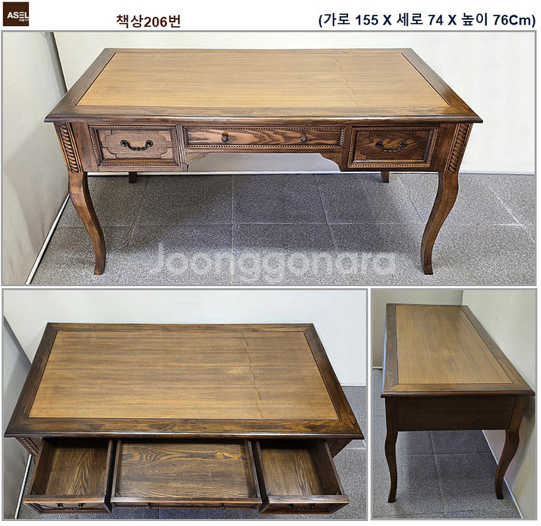 원목으로 제작된 클래식한 디자인의 서랍형 데스크예요. 서랍 3개가 있어 수납력도 좋고, 전체적으로 상태가 양호합니다. 책상 206번 제품으로 실용적이면서도 고급스러운 느낌이에요.경기도 하남시 상일IC 근처에 있는 대형 창고형 매장입니다 호텔중고가구를 전문 판매, 렌탈하고 있으며 전국 착불배송 판매하고 있습니다. 엔틱가구, 빈티지가구, 콘솔, 쇼파, 테이블, 웨곤, 원탁, 러브테이블, 책상, 화장대, 베드벤치, 의자, 식탁, TV장, 수납장, 장식장, 스텐드, 거울, 조명, 분수, 옷걸이, 고가구, 장식대, 파티션, 커튼,액자, 소품, 사무용가구, 카페가구, 식당의자 등을 판매합니다. 업체명 : 아셀가구( http://asel.o-r.kr 거래방식 : 직거래, 온라인 용달착불 매장위치 : 하남시 풍초로 (방문시 예약필수) 문의 O2-488-1OO8, O1O-3113-5O35