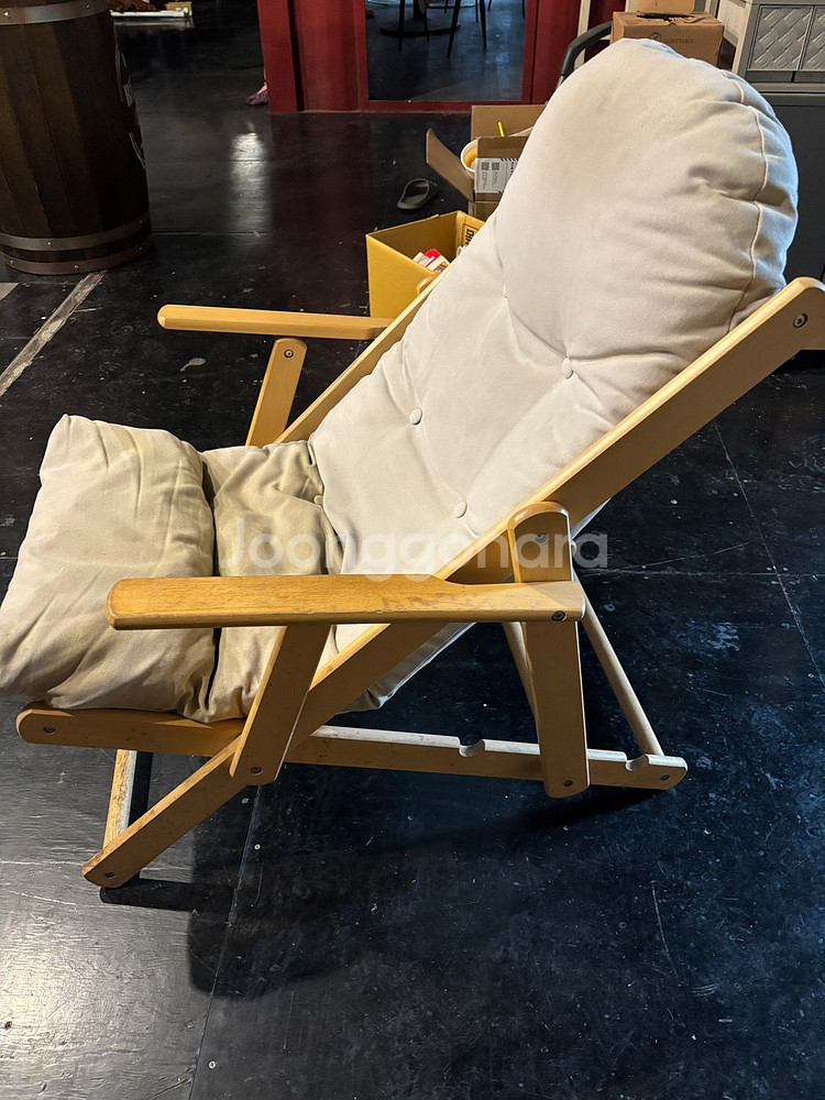 원목 프레임에 베이지 패브릭 쿠션이 포함된 라운지체어예요. 접이식으로 보관이 편리하고 편안한 착석감을 제공합니다. 사용감은 있지만 전체적으로 깔끔한 상태입니다. 색상은 아이보리/차콜이고 구매 원하시는 수량 문의주세요. 운송료는 별도이고 협의하셔야합니다. 직접오셔서 확인 후 가져가셔도 됩니다.