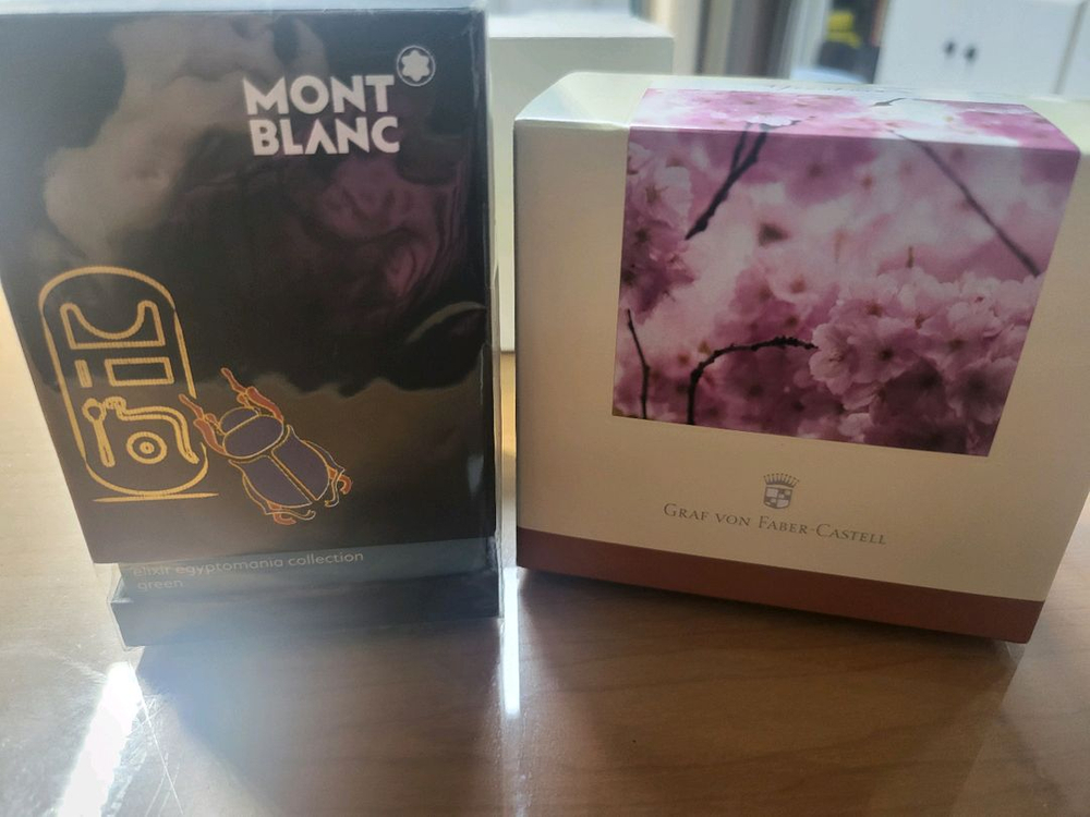 몽블랑 엘릭서 이집토마니아 콜렉션 그린 18만 그라폰 파버카스텔 잉크 요자쿠라 3만 몽블랑 잉크는 직구로 구매했고 그라폰잉크는 국내 구매입니다 몽블랑은 비닐포장이라 열어보지않고 그대로 보관한거고 그라폰은 박스만 열어서 상태확인만 했어요 제가 산 가격보다 좀더 저렴하게 내놔요 우체국택배는 4000원이고 반값택배는 2000원입니다