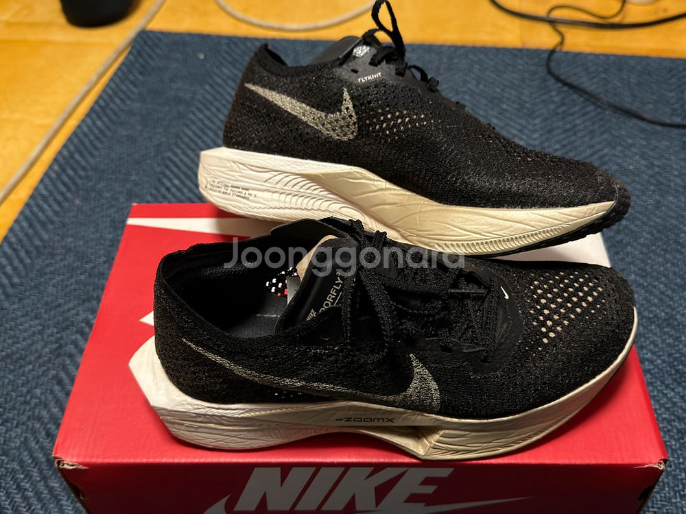 나이키 줌X 베이퍼플라이 넥스트% 3 블랙 색상이에요 사진에서 보이는 것처럼 깔끔한 상태를 유지하고 있어요 러닝 퍼포먼스를 높여줄 기능성 신발을 찾으시는 분들께 추천드려요 구매 후 15km 달렸습니다 박스는 다른 박스랑 바뀌어서 다른 박스입니다
