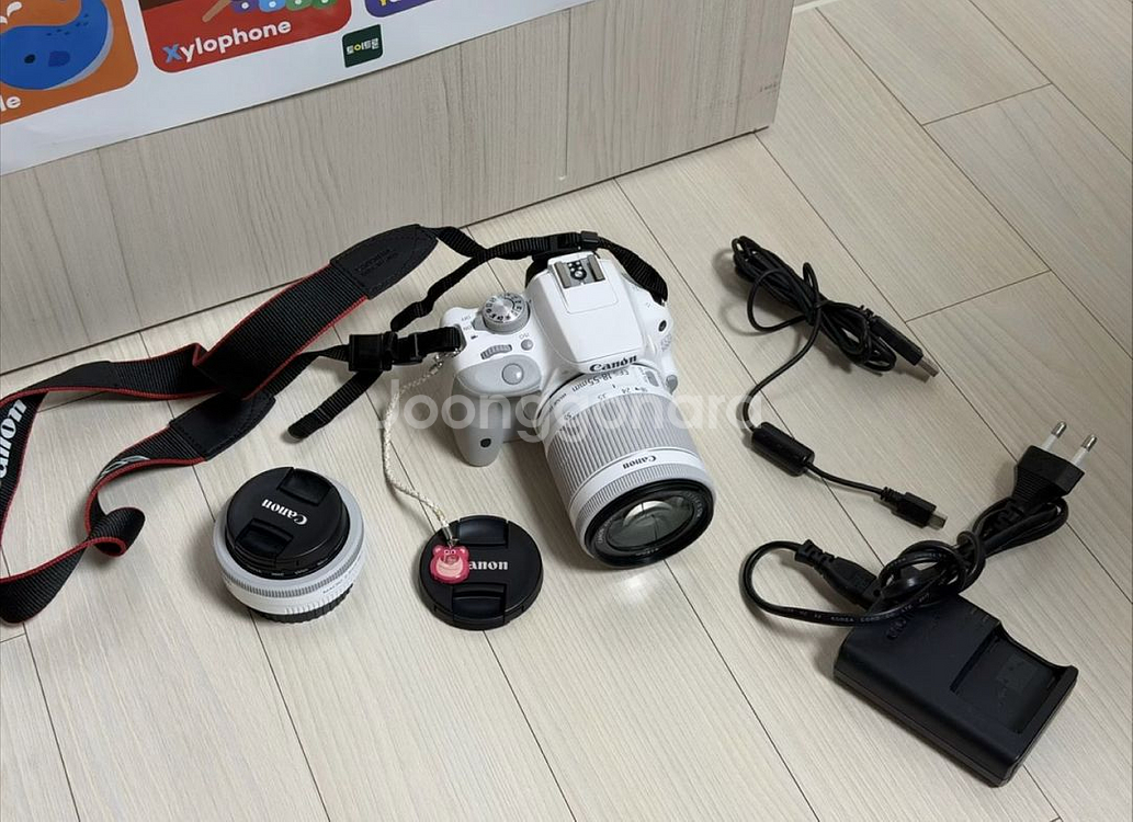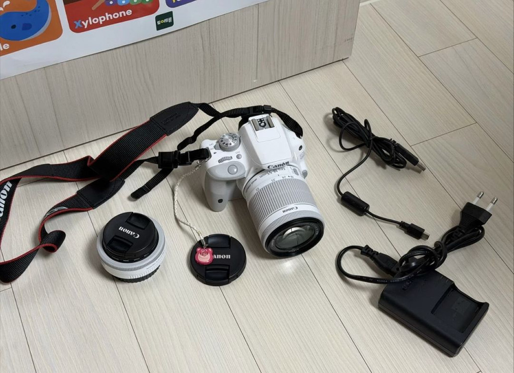 캐논 EOS 100D 화이트 카메라와 렌즈 세트입니다 - EF 18-55mm 렌즈 포함 - EF 40mm 렌즈 포함 - 충전기, 케이블, 스트랩 등 모든 구성품 포함 - 배터리2개 - 박스X 작고 가벼워서 휴대하기 좋고, 다양한 렌즈를 활용하여 사진 촬영을 즐길 수 있습니다 초보자가 사용하기 좋다해서 구매했어요 아이 사진 찍으려 구매했는데 솔직히 사용법을 잘 모르겠어서 많이 못찍은 좋은 상태예요 렌즈는 구매시 포함 된건 아니었고 단렌즈 따로 구매했었어요 화이트는 이제 렌즈 단종돼서 구매하기 어렵다 들었어요