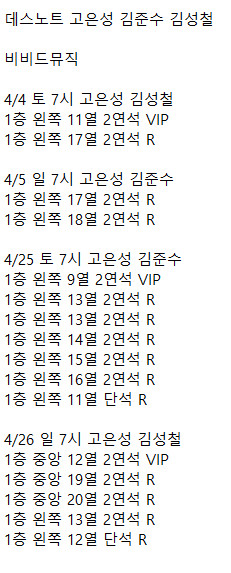 4/4 토 7시 고은성 김성철 1층 왼쪽 11열 2연석 VIP 1층 왼쪽 17열 2연석 R 4/25 토 7시 고은성 김준수 1층 왼쪽 9열 2연석 VIP 1층 왼쪽 13열 2연석 R 1층 왼쪽 13열 2연석 R 1층 왼쪽 14열 2연석 R 1층 왼쪽 15열 2연석 R 1층 왼쪽 16열 2연석 R 1층 왼쪽 11열 단석 R 4/26 일 7시 고은성 김성철 1층 중앙 12열 2연석 VIP 1층 중앙 19열 2연석 R 1층 중앙 20열 2연석 R 1층 왼쪽 13열 2연석 R 1층 왼쪽 12열 단석 R