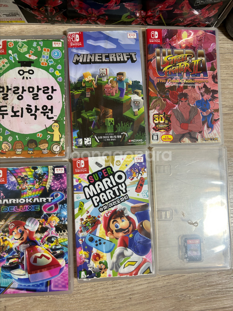 개인정보(거래정보)를 주고받는 행위는 사기에 노출될 수 있으므로 즉시 중고나라로 신고해 주세요스위치 1용 게임칩 6종 마리오 파티 마리오 카트8 말랑말랑 두뇌 마인크래프트 스트리트파이트 냅튠 RPG (케이스는 있으나 표지 없음) 모두 케이스 있는 양품입니다 일괄팜 영10;44영5;82칠칠