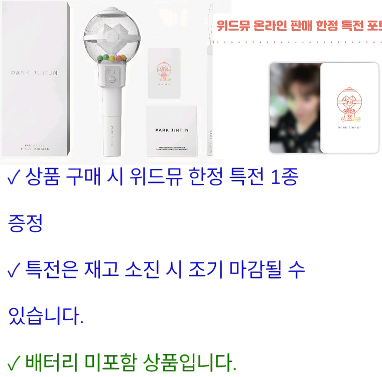 현물X 예약상품O 4/21부터 순차 배송시작 됨 구매하신다고 하시면 구매인증 바로 가능합니다. 2개 구매해서 배송지 변경은 2개함께 구매시에만 가능합니다. - (위드뮤특전 포카는 소진시 별도공지 없이 종료라고 합니다.) 배터리 없습니다 -이점 꼭 확인 후 연락주세요!! - 위드뮤특전 포카같이 배송오면 같이 보내드리고 배송오지 않으면 응원봉만 보내드릴 수 있습니다. 박지훈 응원봉 미개봉 새상품 배미포 80000원에 판매합니다. 위드뮤에서 배송오는데로 실물인증 바로 해드리고 다음날 재배송 해드립니다. 급전이어서 바로구매만 받습니다. 편택 4천원 타 상점 - 평화로운거래원해요와 동일상점입니다. 후기는 여기서 참고부탁드립니다!